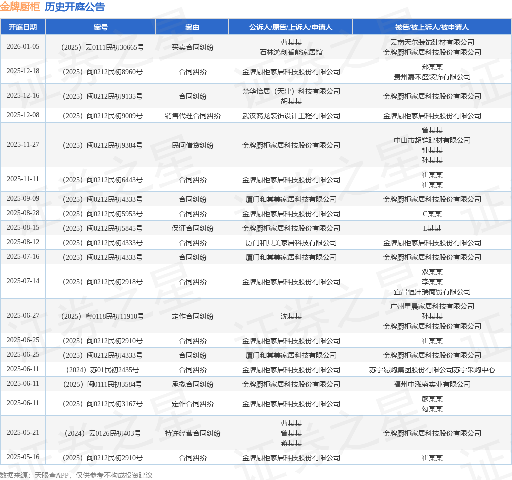 案号:(2025)闽0212民初9384号根据统计,近一年内以金牌厨柜家居科技股份有限公司为当事人的历史开庭公告有27则,其中案由为“合同纠纷”的公告以15则居首,其次为“定作合同纠纷”有4则,“买卖合同纠纷”有2则。历史开庭公告(前20条)如下: