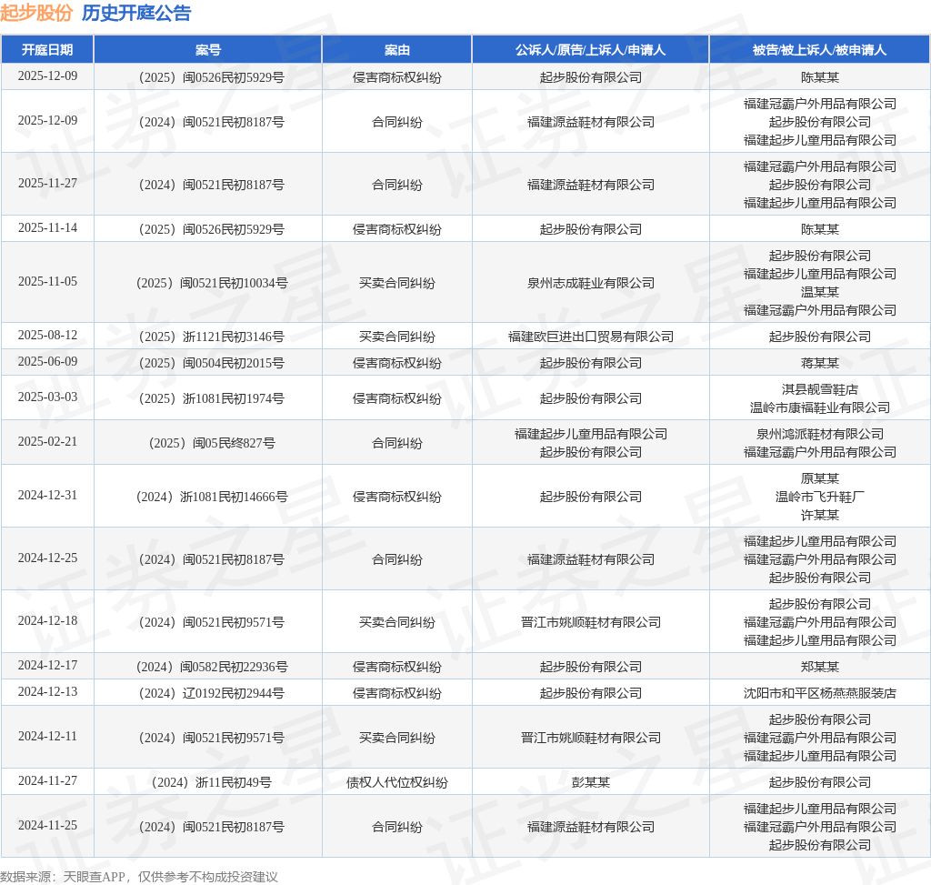 根据统计,近一年内以起步股份有限公司为当事人的历史开庭公告有17则,其中案由为“侵害商标权纠纷”的公告以7则居首,其次为“合同纠纷”有5则,“买卖合同纠纷”有4则。历史开庭公告如下: