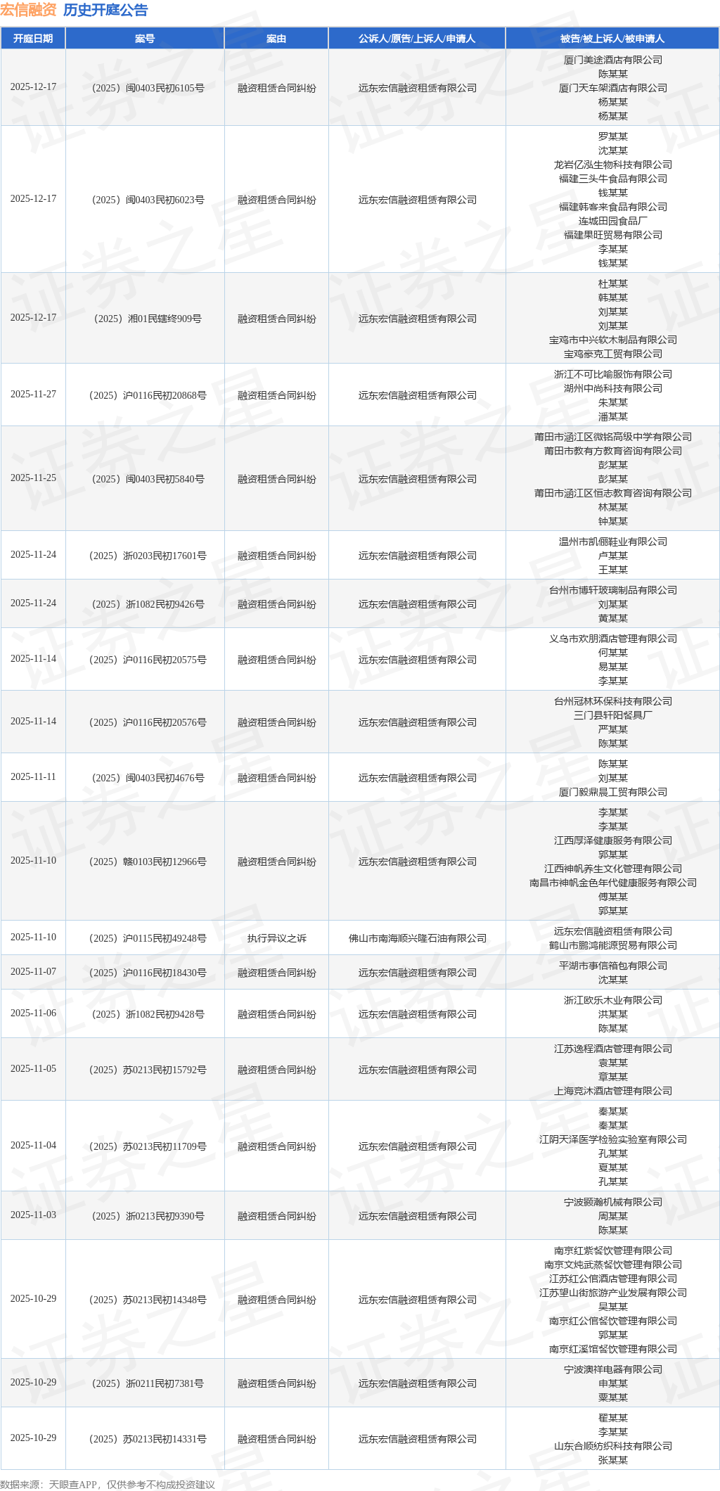 案号:(2025)沪0116民初20868号根据统计,近一年内以远东宏信融资租赁有限公司为当事人的历史开庭公告有120则,其中案由为“融资租赁合同纠纷”的公告以117则居首,其次为“租赁合同”有2则,“执行异议之诉”有1则。历史开庭公告(前20条)如下: