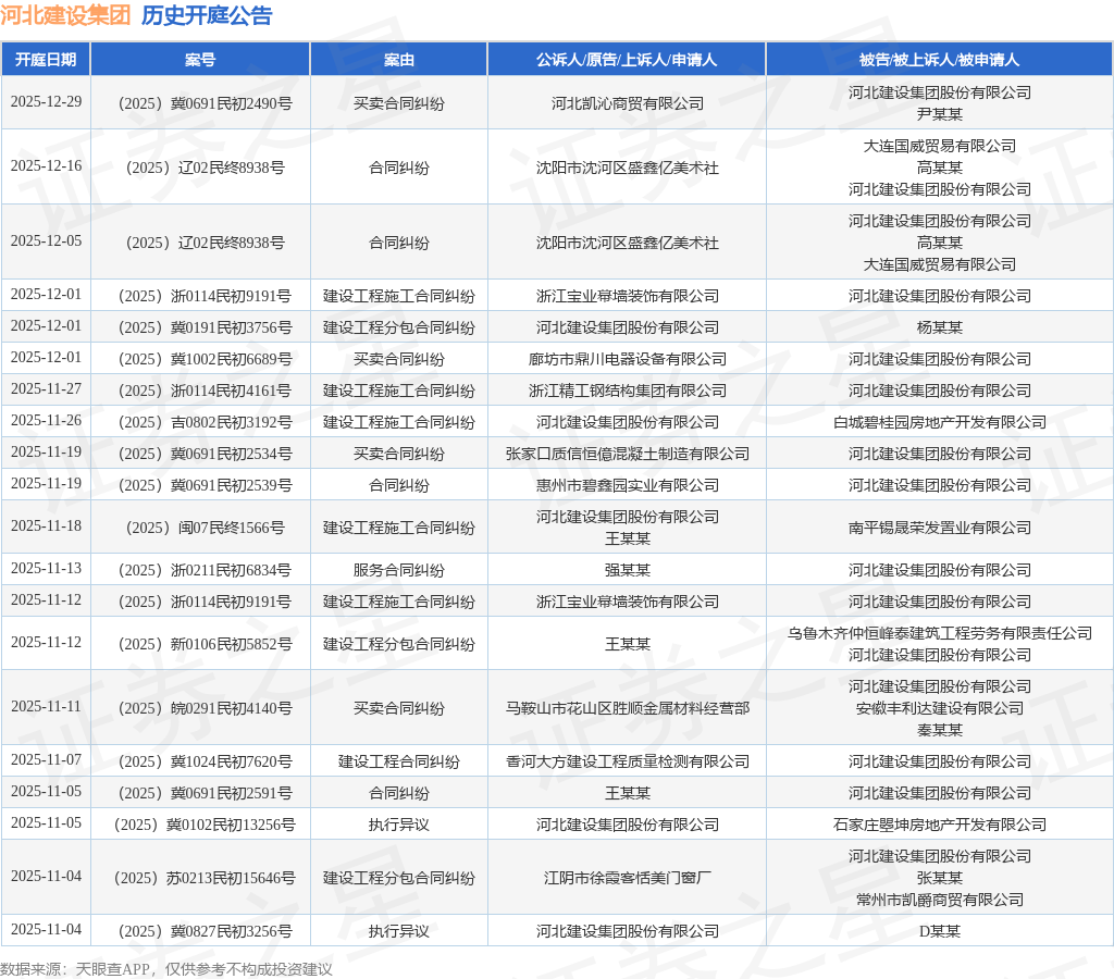 证券之星消息,根据天眼查APP显示,近日公布了一则河北建设集团股份有限公司作为被告/被上诉人的开庭公告,详细内容如下:
