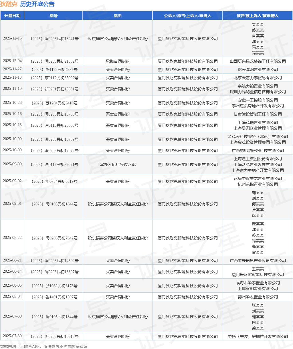 案号:(2025)浙1122民初4987号根据统计,近一年内以厦门狄耐克智能科技股份有限公司为当事人的历史开庭公告有95则,其中案由为“买卖合同纠纷”的公告以63则居首,其次为“合同纠纷”有23则,“股东损害公司债权人利益责任纠纷”有4则。历史开庭公告(前20条)如下: