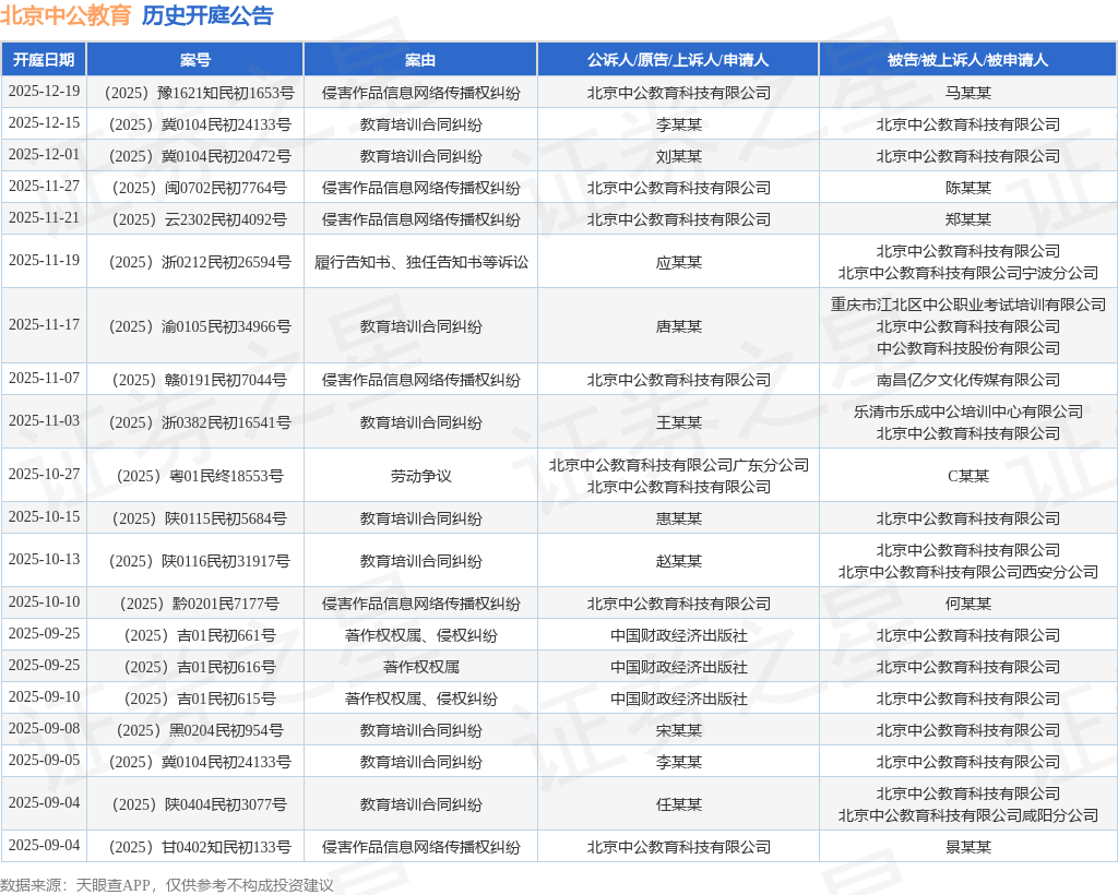 证券之星消息,根据天眼查APP显示,近日公布了一则北京中公教育科技有限公司作为原告/上诉人的开庭公告,详细内容如下: