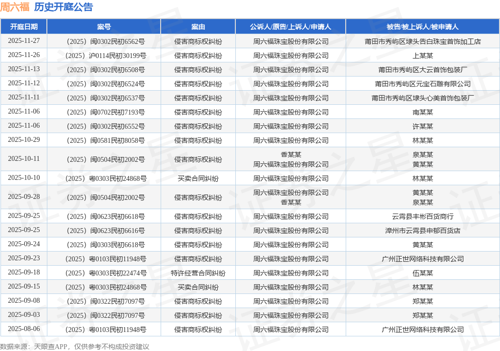 案号:(2025)闽0302民初6562号根据统计,近一年内以周六福珠宝股份有限公司为当事人的历史开庭公告有49则,其中案由为“侵害商标权纠纷”的公告以38则居首,其次为“商标行政纠纷”有3则,“买卖合同纠纷”有2则。历史开庭公告(前20条)如下: