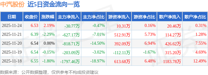 证券之星消息,截至2025年11月24日收盘,中汽股份(301215)报收于6.53元,上涨2.19%,换手率0.77%,成交量10.13万手,成交额6564.6万元。