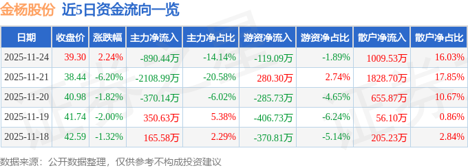 证券之星消息,截至2025年11月24日收盘,金杨股份(301210)报收于39.3元,上涨2.24%,换手率3.73%,成交量1.62万手,成交额6296.04万元。