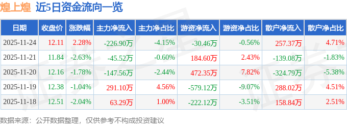 证券之星消息,截至2025年11月24日收盘,煌上煌(002695)报收于12.11元,上涨2.28%,换手率0.89%,成交量4.55万手,成交额5469.84万元。