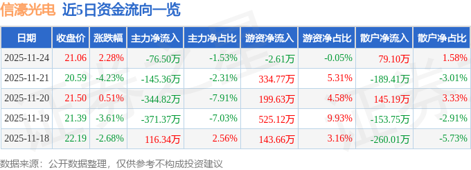证券之星消息,截至2025年11月24日收盘,信濠光电(301051)报收于21.06元,上涨2.28%,换手率1.49%,成交量2.4万手,成交额5016.04万元。