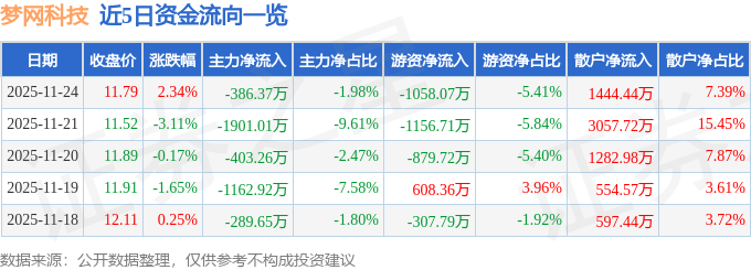 证券之星消息,截至2025年11月24日收盘,梦网科技(002123)报收于11.79元,上涨2.34%,换手率2.32%,成交量16.74万手,成交额1.95亿元。