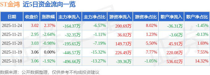 证券之星消息,截至2025年11月24日收盘,ST金鸿(000669)报收于3.02元,上涨2.37%,换手率1.22%,成交量8.32万手,成交额2503.14万元。