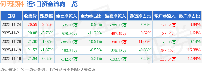 证券之星消息,截至2025年11月24日收盘,何氏眼科(301103)报收于20.59元,上涨2.54%,换手率1.13%,成交量1.78万手,成交额3646.58万元。