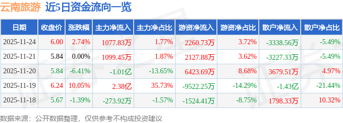 证券之星消息,截至2025年11月24日收盘,云南旅游(002059)报收于6.0元,上涨2.74%,换手率10.35%,成交量101.71万手,成交额6.08亿元。