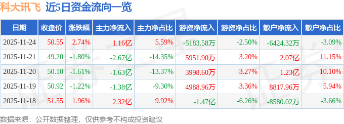 证券之星消息,截至2025年11月24日收盘,科大讯飞(002230)报收于50.55元,上涨2.74%,换手率1.9%,成交量41.53万手,成交额20.77亿元。