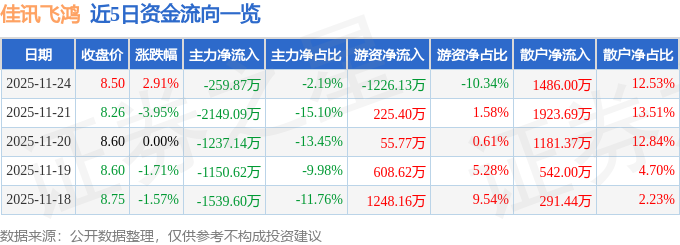 证券之星消息,截至2025年11月24日收盘,佳讯飞鸿(300213)报收于8.5元,上涨2.91%,换手率2.56%,成交量14.14万手,成交额1.19亿元。