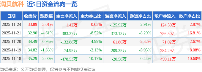 证券之星消息,截至2025年11月24日收盘,润贝航科(001316)报收于33.89元,上涨3.01%,换手率1.15%,成交量1.28万手,成交额4331.8万元。