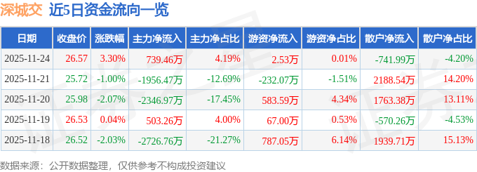 证券之星消息,截至2025年11月24日收盘,深城交(301091)报收于26.57元,上涨3.3%,换手率1.27%,成交量6.69万手,成交额1.77亿元。