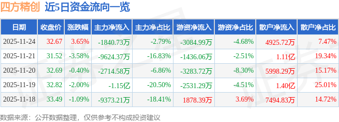 证券之星消息,截至2025年11月24日收盘,四方精创(300468)报收于32.67元,上涨3.65%,换手率3.86%,成交量20.44万手,成交额6.6亿元。