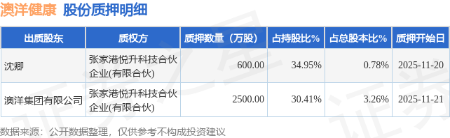 证券之星消息,澳洋健康(002172)11月25日公开信息显示,股东沈卿、澳洋集团有限公司向张家港悦升科技合伙企业(有限合伙)合计质押3100.0万股,占总股本4.04%。质押详情见下表: