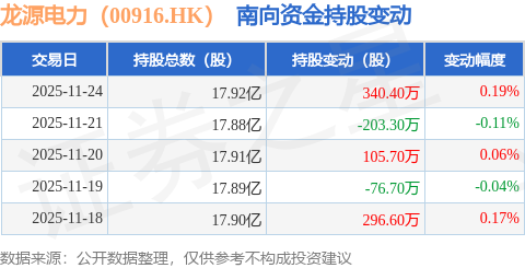 证券之星消息,11月24日南向资金增持340.4万股龙源电力(00916.HK)。近5个交易日中,获南向资金增持的有3天,累计净增持462.7万股。近20个交易日中,获南向资金增持的有14天,累计净增持4362.71万股。截至目前,南向资金持有龙源电力(00916.HK)17.92亿股,占公司已发行普通股的54.0%。
