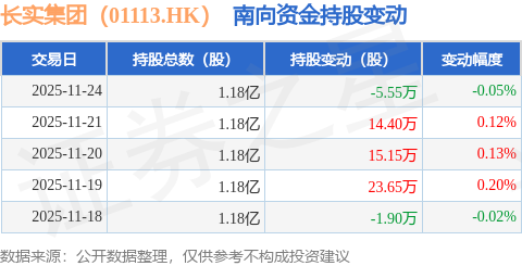 证券之星消息,11月24日南向资金减持5.55万股长实集团(01113.HK)。近5个交易日中,获南向资金增持的有3天,累计净增持45.75万股。近20个交易日中,获南向资金增持的有13天,累计净增持157.02万股。截至目前,南向资金持有长实集团(01113.HK)1.18亿股,占公司已发行普通股的3.37%。