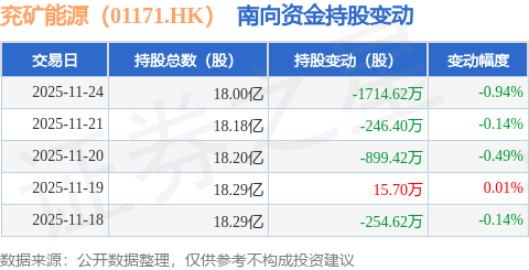 证券之星消息,11月24日南向资金减持1714.62万股兖矿能源(01171.HK)。近5个交易日中,获南向资金减持的有4天,累计净减持3099.36万股。近20个交易日中,获南向资金减持的有13天,累计净减持7450.84万股。截至目前,南向资金持有兖矿能源(01171.HK)18.0亿股,占公司已发行普通股的44.16%。