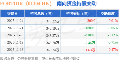 证券之星消息,11月24日南向资金增持300.0股FORTIOR(01304.HK)。近5个交易日中,获南向资金减持的有3天,累计净减持1.39万股。近20个交易日中,获南向资金增持的有11天,累计净增持16.46万股。截至目前,南向资金持有FORTIOR(01304.HK)343.22万股,占公司已发行普通股的15.91%。