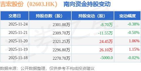 证券之星消息,11月24日南向资金减持8.7万股吉宏股份(02603.HK)。近5个交易日中,获南向资金增持的有2天,累计净增持29.8万股。近20个交易日中,获南向资金增持的有9天,累计净增持39.1万股。截至目前,南向资金持有吉宏股份(02603.HK)2301.0万股,占公司已发行普通股的33.87%。