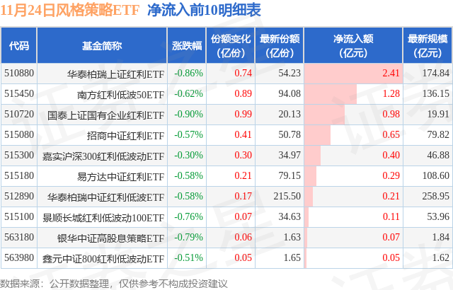 当日有17只风格策略ETF基金出现资金净流入,其中净流入排首位的是华泰柏瑞上证红利ETF(510880),份额增加了7450.0万份,净流入额为2.41亿元。