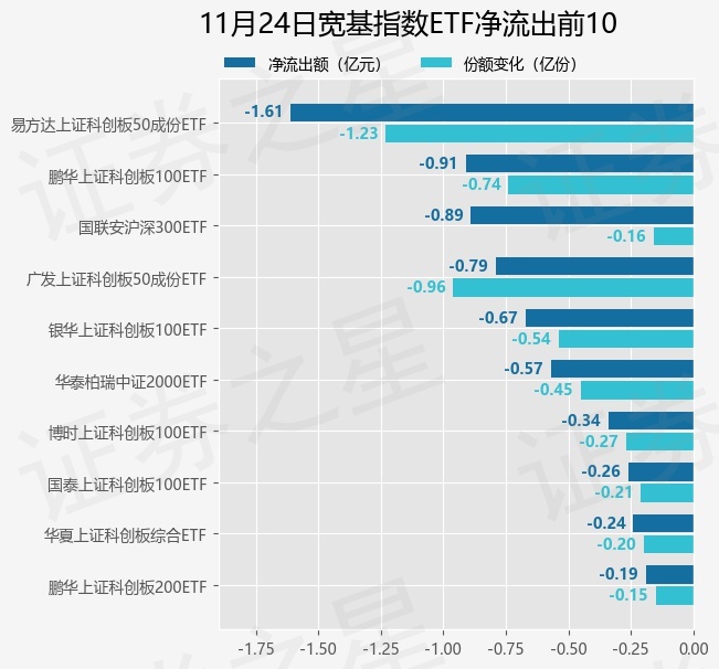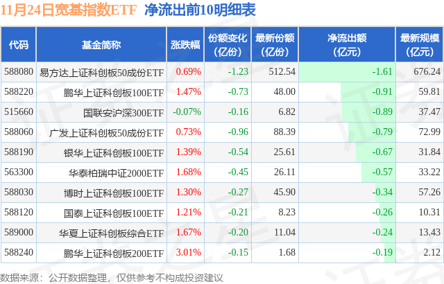 当日有29只宽基指数ETF基金出现资金净流出,其中净流出排首位的是易方达上证科创板50成份ETF(588080),份额减少了1.23亿份,净流出额为1.61亿元。