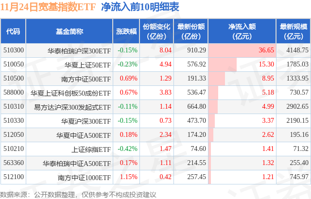 当日有71只宽基指数ETF基金出现资金净流入,其中净流入排首位的是华泰柏瑞沪深300ETF(510300),份额增加了8.04亿份,净流入额为36.65亿元。