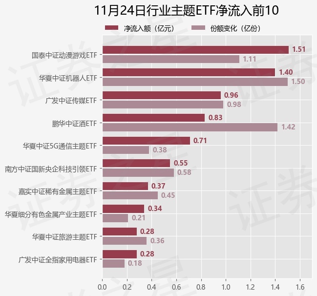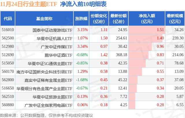 当日有77只行业主题ETF基金出现资金净流入,其中净流入排首位的是国泰中证动漫游戏ETF(516010),份额增加了1.11亿份,净流入额为1.51亿元。