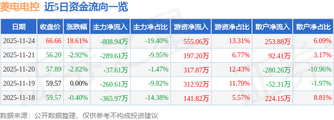 证券之星消息,截至2025年11月24日收盘,菱电电控(688667)报收于66.66元,上涨18.61%,换手率1.41%,成交量7364.0手,成交额4169.33万元。