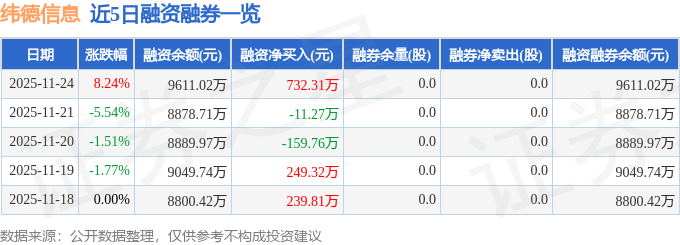 纬德信息融资融券信息显示,融资方面,当日融资买入1221.15万元,融资偿还488.84万元,融资净买入732.31万元。融券方面,融券卖出0.0股,融券偿还0.0股,融券余量0.0股,融券余额0.0万元。融资融券余额9611.02万元。