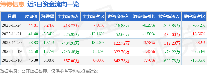 证券之星消息,截至2025年11月24日收盘,纬德信息(688171)报收于44.81元,上涨8.24%,换手率1.62%,成交量1.35万手,成交额5905.02万元。