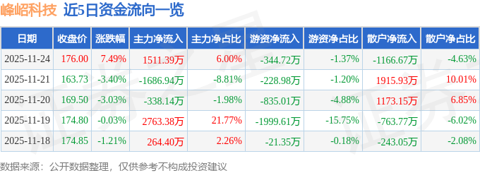 证券之星消息,截至2025年11月24日收盘,峰岹科技(688279)报收于176.0元,上涨7.49%,换手率1.56%,成交量1.46万手,成交额2.52亿元。
