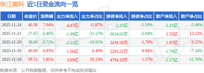 证券之星消息,截至2025年11月24日收盘,张江高科(600895)报收于40.3元,上涨7.04%,换手率6.48%,成交量100.36万手,成交额40.36亿元。
