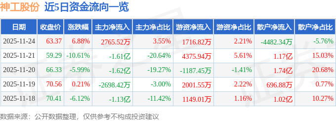 证券之星消息,截至2025年11月24日收盘,神工股份(688233)报收于63.37元,上涨6.88%,换手率7.27%,成交量12.39万手,成交额7.78亿元。