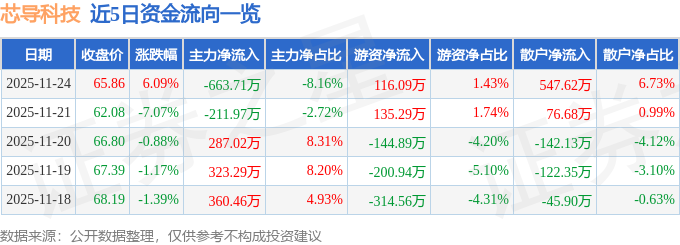 证券之星消息,截至2025年11月24日收盘,芯导科技(688230)报收于65.86元,上涨6.09%,换手率1.08%,成交量1.26万手,成交额8135.62万元。