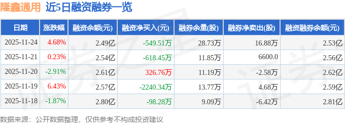 隆鑫通用融资融券信息显示,融资方面,当日融资买入1224.18万元,融资偿还1773.7万元,融资净偿还549.51万元。融券方面,融券卖出16.98万股,融券偿还1000.0股,融券余量28.73万股,融券余额392.16万元。融资融券余额2.53亿元。