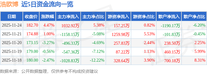 证券之星消息,截至2025年11月24日收盘,浩欧博(688656)报收于182.7元,上涨4.47%,换手率1.69%,成交量1.07万手,成交额1.92亿元。