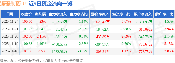 证券之星消息,截至2025年11月24日收盘,泽璟制药(688266)报收于105.5元,上涨4.23%,换手率1.04%,成交量2.75万手,成交额2.87亿元。