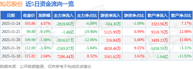 证券之星消息,截至2025年11月24日收盘,灿芯股份(688691)报收于103.86元,上涨4.07%,换手率6.4%,成交量4.58万手,成交额4.64亿元。
