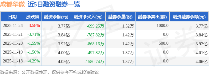 成都华微融资融券信息显示,融资方面,当日融资买入1099.46万元,融资偿还1798.71万元,融资净偿还699.25万元。融券方面,融券卖出1000.0股,融券偿还0.0股,融券余量1.52万股,融券余额56.36万元。融资融券余额3.77亿元。