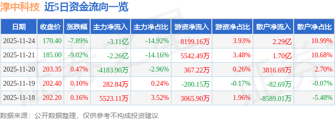 证券之星消息,截至2025年11月24日收盘,淳中科技(603516)报收于170.4元,下跌7.89%,换手率5.98%,成交量12.16万手,成交额20.87亿元。
