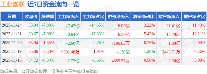 证券之星消息,截至2025年11月24日收盘,工业富联(601138)报收于55.94元,下跌7.8%,换手率1.67%,成交量332.01万手,成交额187.24亿元。