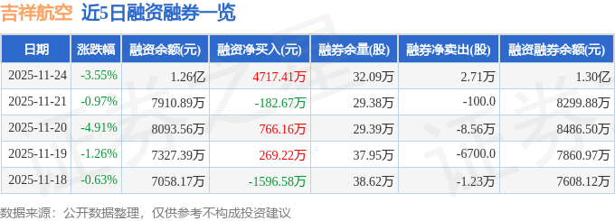 吉祥航空融资融券信息显示,融资方面,当日融资买入5874.42万元,融资偿还1157.01万元,融资净买入4717.41万元。融券方面,融券卖出3.35万股,融券偿还6400.0股,融券余量32.09万股,融券余额409.79万元。融资融券余额1.3亿元。