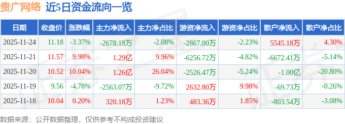 证券之星消息,截至2025年11月24日收盘,贵广网络(600996)报收于11.18元,下跌3.37%,换手率9.31%,成交量116.04万手,成交额12.88亿元。