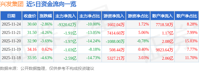 证券之星消息,截至2025年11月24日收盘,兴发集团(600141)报收于30.6元,下跌2.86%,换手率2.75%,成交量30.34万手,成交额9.32亿元。