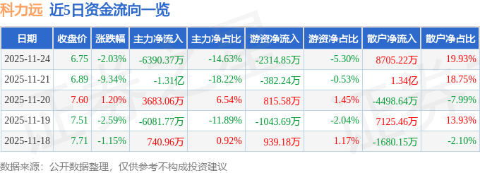 证券之星消息,截至2025年11月24日收盘,科力远(600478)报收于6.75元,下跌2.03%,换手率3.89%,成交量64.82万手,成交额4.37亿元。