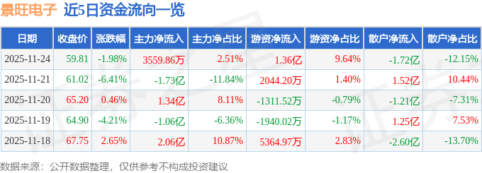 证券之星消息,截至2025年11月24日收盘,景旺电子(603228)报收于59.81元,下跌1.98%,换手率2.4%,成交量23.41万手,成交额14.16亿元。
