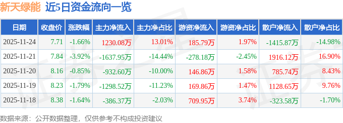 证券之星消息,截至2025年11月24日收盘,新天绿能(600956)报收于7.71元,下跌1.66%,换手率0.52%,成交量12.21万手,成交额9454.69万元。